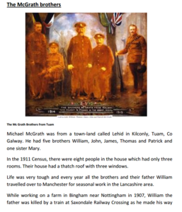 Prizewinning student project from the All-Island History Competition 2017 within the category of Ireland and World War 1. The project explores the Speech from John Redmond (First Home Rule Party Leader) in Tuam, December 1914. Details include a description of Tuam in 1914, the speech and the reaction to in Tuam to John Redmond's speech. Students have also documented some men from Tuam who died in the WW1.
