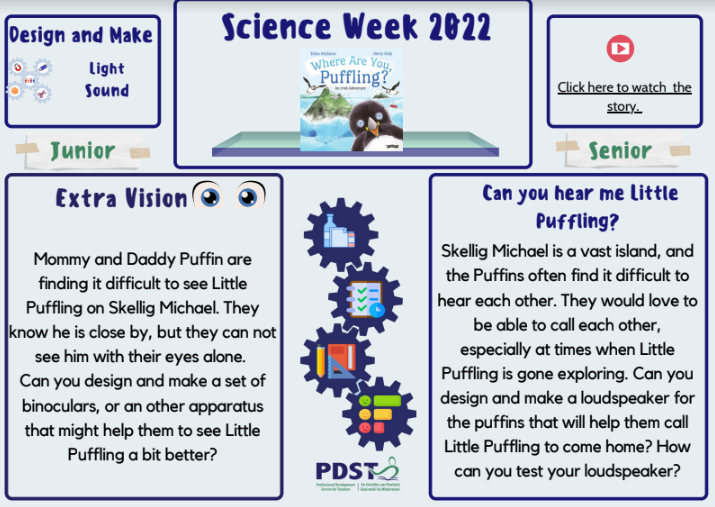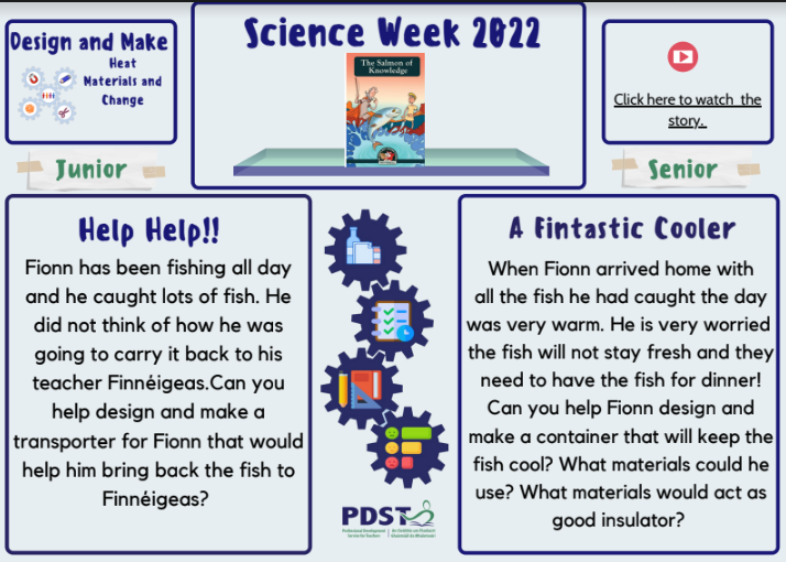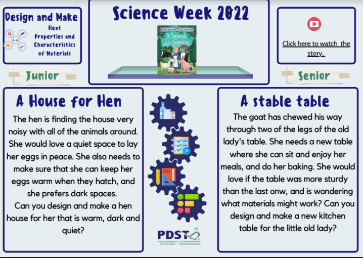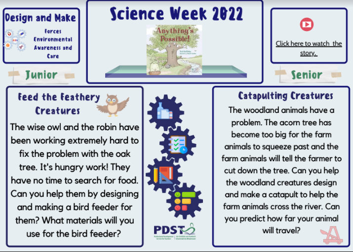 Welcome to the PDST Primary STEM Science Week 2022 page. We are delighted to partner with Scoilnet again to bring you fun and enjoyable activities. This year the Primary STEM team aim is to spotlight how to infuse the playful nature of story with the Design and Make Process in Science.