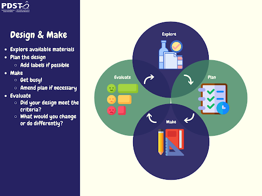 We have selected five books to demonstrate how a story can be used to provide a context for a Design and Make activity. The design and make process of Explore, Plan, Make and Evaluate, as outlined in the image is encouraged.