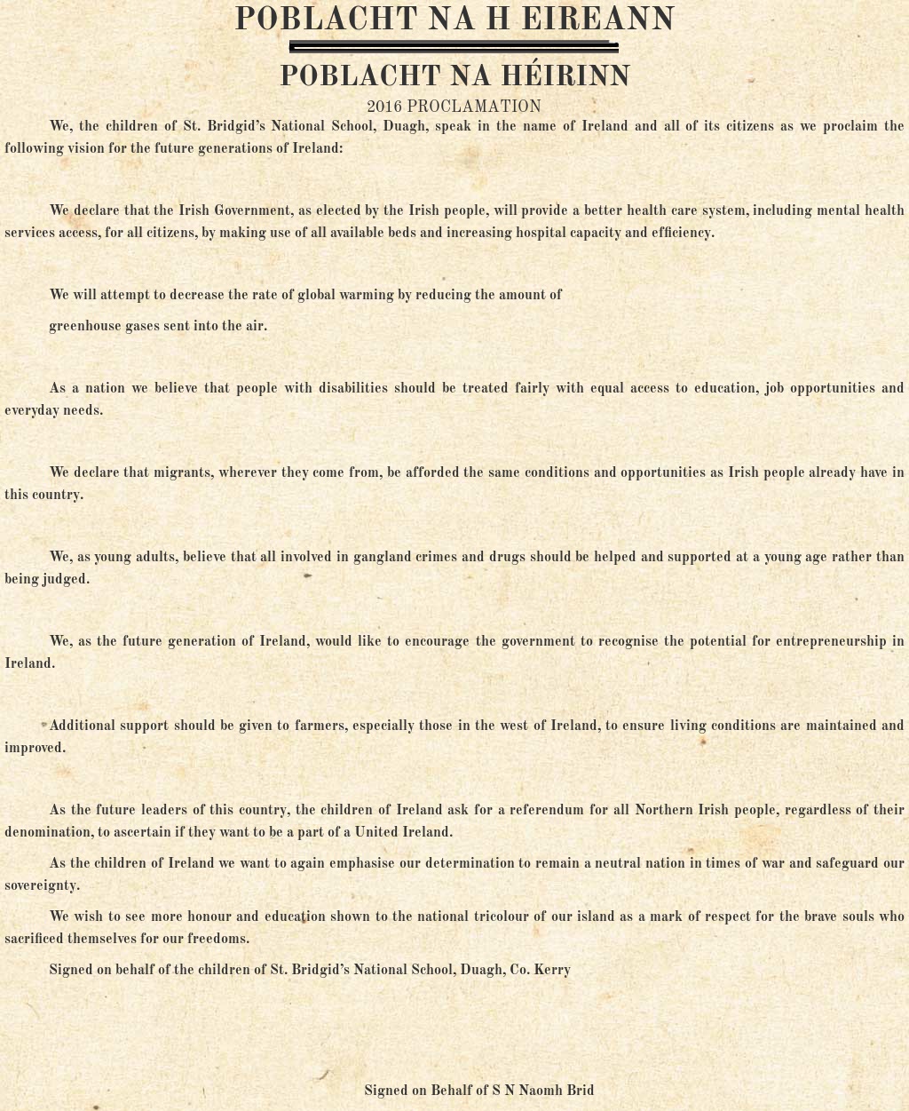 We, the children of St. Bridgid’s National School, Duagh, speak in the name of Ireland and all of its citizens as we proclaim the following vision for the future generations of Ireland: