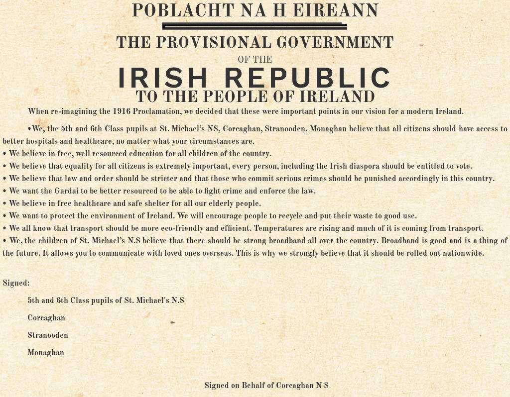 •We, the 5th and 6th Class pupils at St. Michael’s NS, Corcaghan, Stranooden, Monaghan believe that all citizens should have access to better hospitals and healthcare, no matter what your circumstances are.