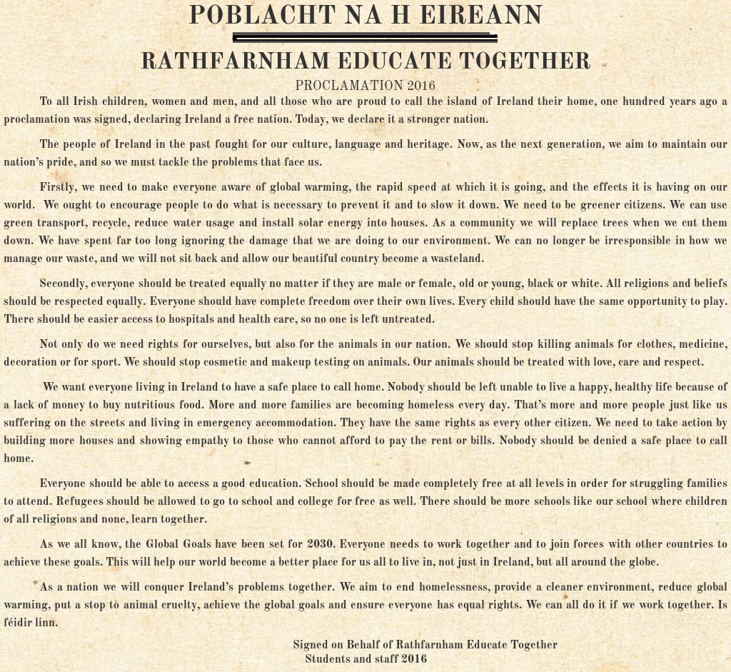 To all Irish children, women and men, and all those who are proud to call the island of Ireland their home, one hundred years ago a proclamation was signed, declaring Ireland a free nation. Today, we declare it a stronger nation.