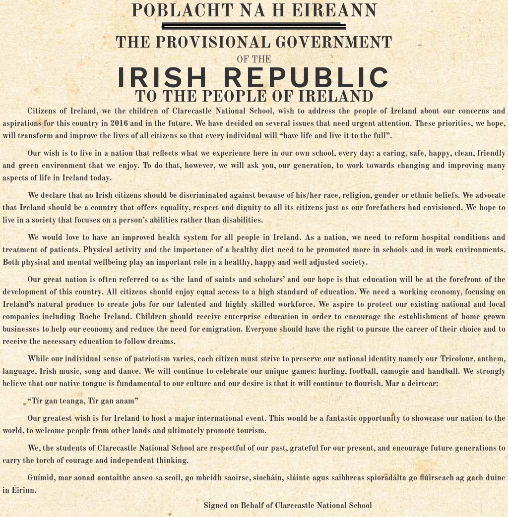 Citizens of Ireland, we the children of Clarecastle National School, wish to address the people of Ireland about our concerns and aspirations for this country in 2016 and in the future. We have decided on several issues that need urgent attention. These priorities, we hope, will transform and improve the lives of all citizens so that every individual will “have life and live it to the full”.