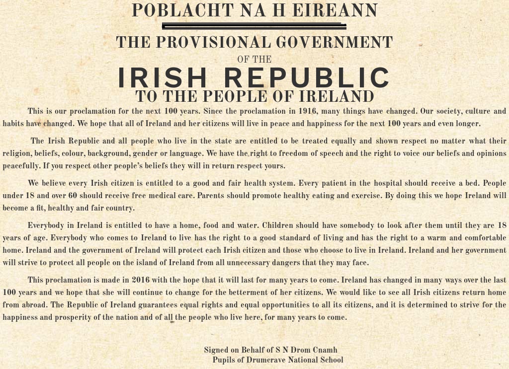 This Proclamation was written by the children from Second to Sixth Class in Drumcrave National School