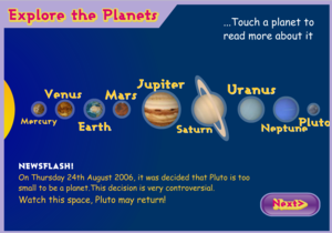 A very visual and student friendly resource to use when learning about the solar system. The animation allows students to interact with the solar system planets by clicking on each planet to learn more about the planet. A way of remembering the order of the planets is then explained and students must interact with the animation in placing the planets in the correct order. A quiz on the planets is located at the end of the animation with three basic questions.