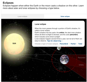 A lovely animation which visually explains the differences between the solar eclipse and the lunar eclipse. The lunar and solar animations both have a description to read. Students can also find out more tips about observing solar eclipses or even visit NASA's calendar for upcoming eclipses.